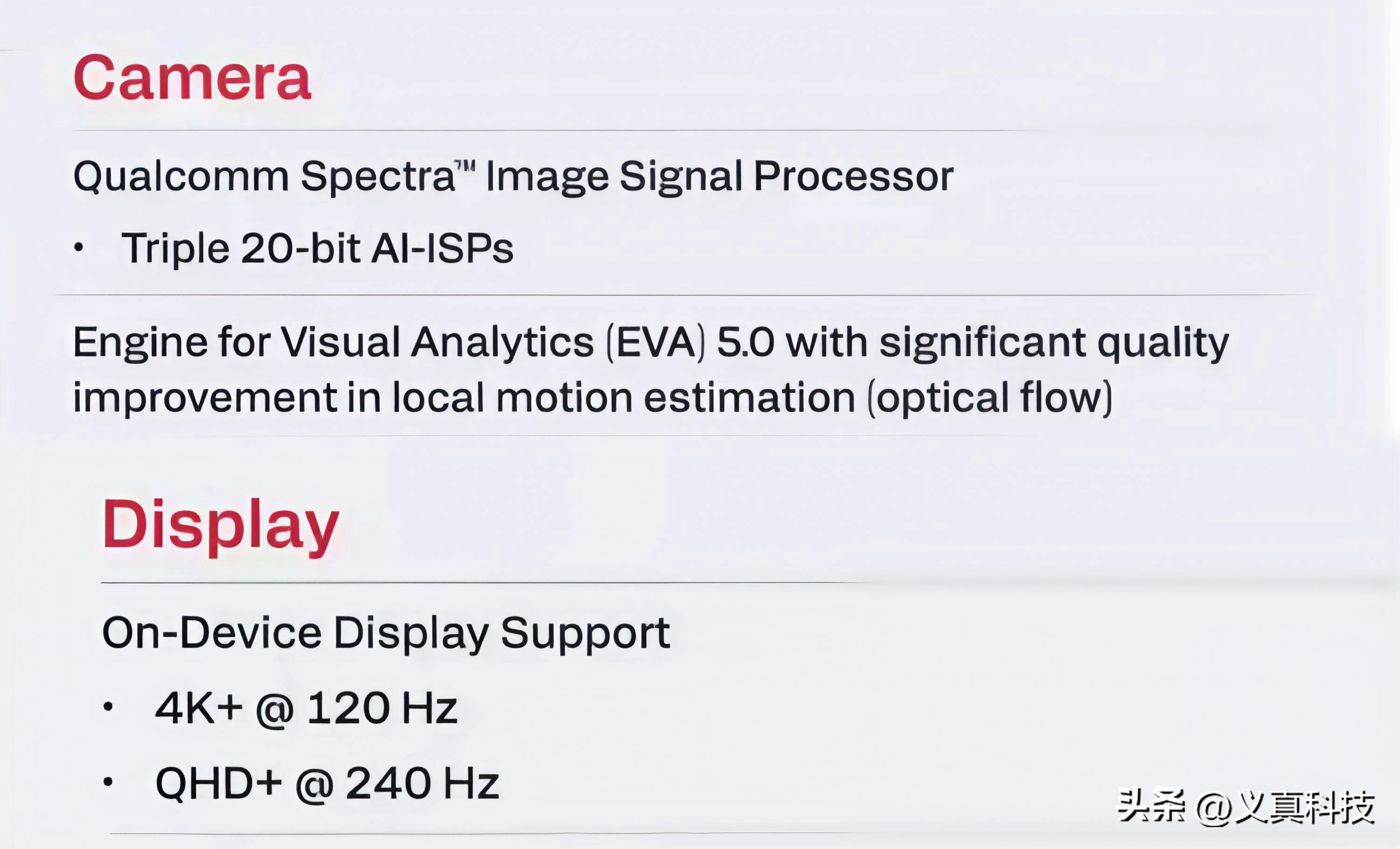 其它证据还有,其20bit的三核ISP与骁龙8E5是同款,而骁龙8E的则是18bit的三核ISP;此外其所支持的最高屏幕规格也与骁龙8E5一致,所基于的制程也是骁龙8E5同款的台积电N3P工艺。