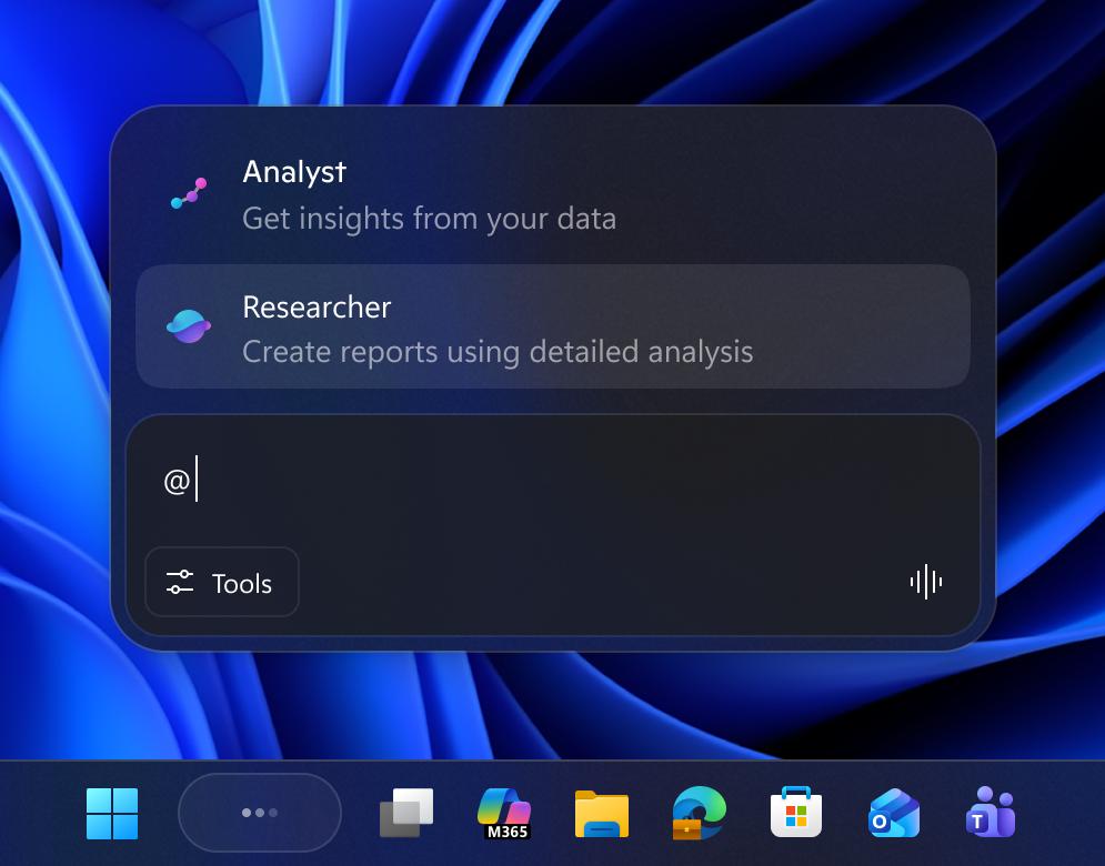 任务栏新增“Ask Copilot”入口,该功能集成了 Microsoft 365 Copilot、智能体及搜索功能,用户可直接调用“Work IQ”上下文或通过“@”符号唤醒智能体。