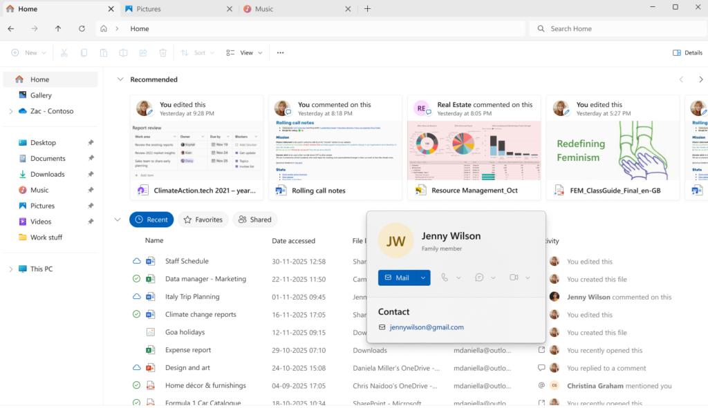 在文件资源管理器中,使用个人微软账户的用户现在可以在“活动”列看到协作者头像,悬停即可触发“人脉卡片(Windows People Card)”以快速发起沟通。此前该功能仅限于企业账户,现已扩展至消费者版本。