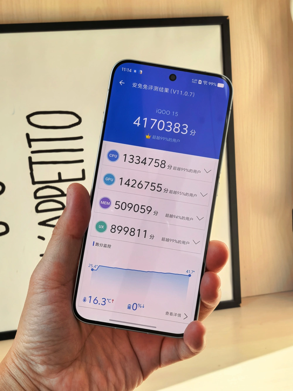 配置上一如既往的顶:第五代骁龙8至尊版处理器,4nm的制程工艺,CPU主频高达4.6GHz,随手跑个分,轻松上417万。得益于自研Q3电竞芯片,集成渲染核、光追核、AI核三大核心,在《原神》开启2K+120帧超分超帧模式时,通过动态插帧技术实现画质与功耗的平衡。8K VC冰穹散热系统面积较上代提升14%,配合双层石墨烯导热层,在《崩铁》黄金时刻地图60帧运行测试中,机身最高温度控制在37.7℃,触控响应延迟低至0.1ms。