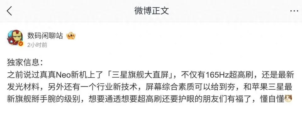 日前,“数码闲聊站”再次曝出了一款Neo系列新机的屏幕信息,据其称,“之前说过真真Neo新机上了「三星旗舰大直屏」,不仅有165Hz超高刷,还是最新发光材料,另外还有一个行业新技术,屏幕综合素质可以给到夯,和苹果三星最新旗舰掰手腕的级别,想要通透想要超高刷还要护眼的朋友们有福了,懂自懂”。
