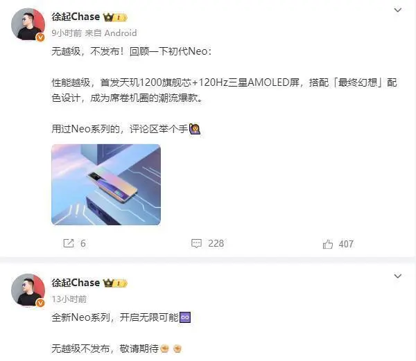 同时,日前,@徐起Chase 也加入了关于Neo系列新机的预热,据其称,“全新Neo系列,开启无限可能∞ 无越级不发布,敬请期待”“无越级,不发布!回顾一下初代Neo:性能越级,首发天玑1200旗舰芯+120Hz三星AMOLED屏,搭配「最终幻想」配色设计,成为席卷机圈的潮流爆款。”