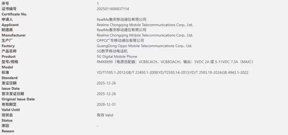 另外,近日,网间还曾曝光过一款型号为RMX8899的realme新机获得国家质量3C认证的截图,并且据“数码闲聊站”爆料,该机大概率就是真我Neo8,其配备VCB8CACH、VCB8OACH电源适配器,支持最高80W(11V 7.3A)有线快充。汇总目前的爆料来看,该机还将搭载高通骁龙8 Gen5处理器,配备金属中框+玻璃机身,支持3D超声波指纹+IP68防尘防水,暂定2026年1月发布,预计起售价2000-2500元。 |
