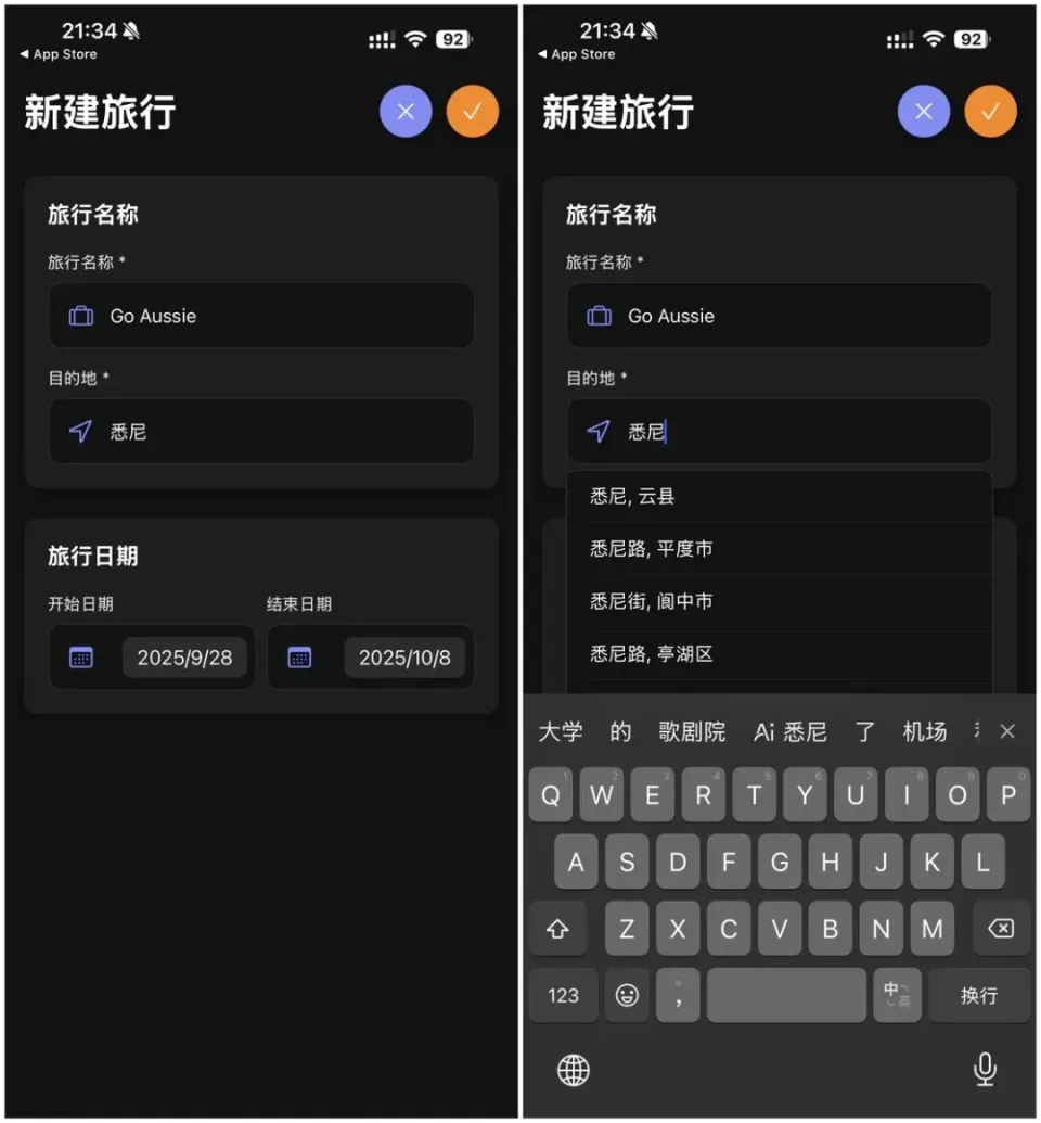 搜不到海外地区,那我手动输入行不行?行,也不行。行,是因为手动输入目的地也能创建行程;不行,是因为手动输入的目的地不会匹配当地的插座信息、货币信息和天气信息。