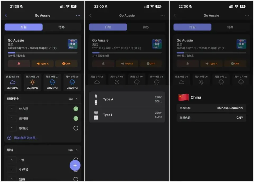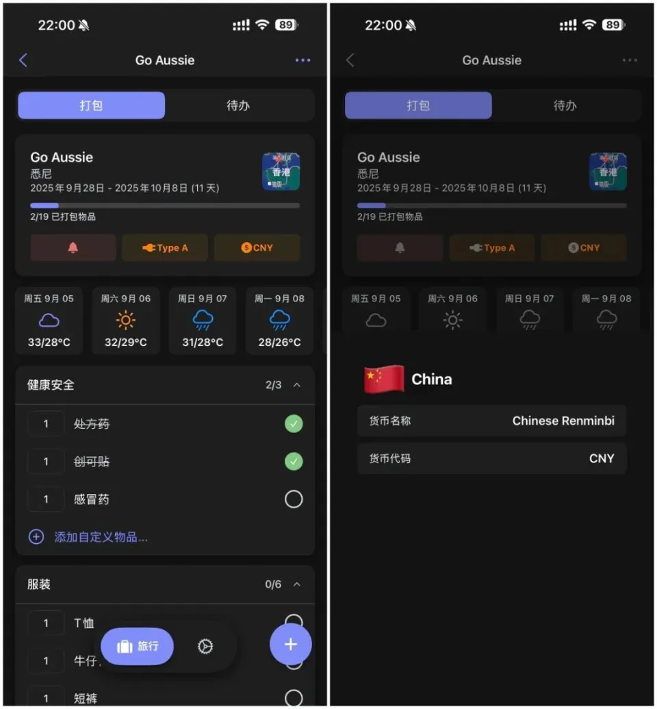 添加完成后,我们可以随时点击物品右侧的圆圈来标记完成,同时也可以在行程卡片中看到所有随身物品准备的整体进度。