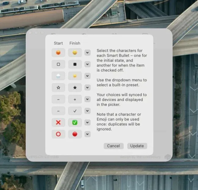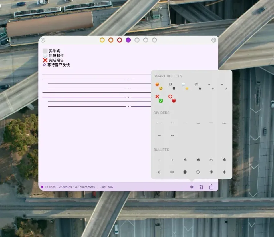Smart Bullets 是一对含义相反的符号列表,如和来表示任务完成情况。现在 Tot 可以选用符号或 Emoji 来创建个性化的 Smart Bullets 配对,最多创建 8 组自定义符号对。在 iOS 上,Smart Bullets 可以通过 Quick Key 快速插入使用;在 macOS 上可以通过菜单操作插入。在 Tot 中,每次点按文本中的符号对,该符号还会在你设置的成对符号之间切换,这样你就可以像 Todo 清单一样,随时打勾或恢复,非常方便。