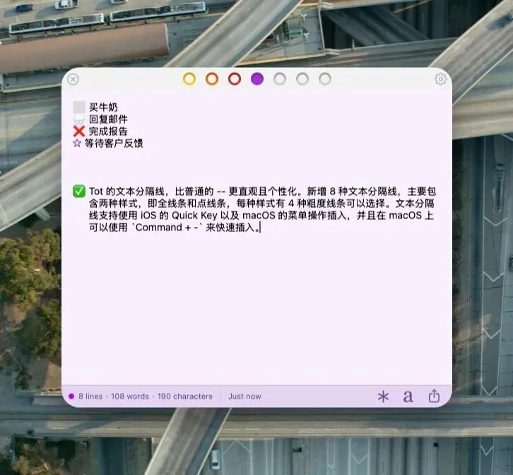 Tot 的文本分隔线比普通的 -- 更直观且个性化,本次更新新增了 8 种文本分隔线,主要包含两种样式,即全线条和点线条,每种样式有 4 种粗度线条可以选择。文本分隔线支持使用 iOS 的 Quick Key 以及 macOS 的菜单操作插入,并且在 macOS 上可以使用 Command + - 来快速插入。