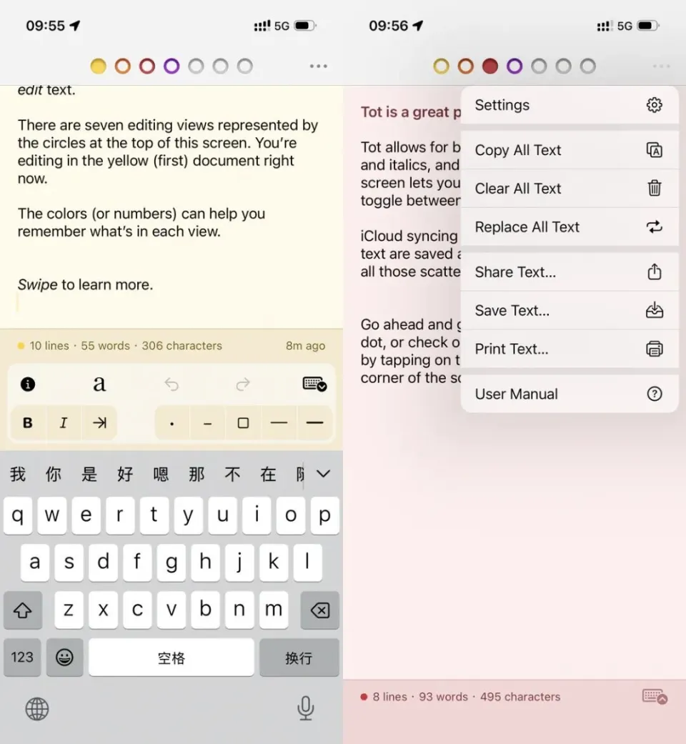 在不同的平台上,Tot 也分别优化了使用体验。在 macOS 端,应用支持菜单栏弹出式窗口、桌面完整窗口两种唤醒方式,桌面窗口支持常驻前台显示。应用还提供了十余款精美的图标。在 iOS 端,新增右上角「…」主菜单按钮,一键进入设置、执行批量操作(如复制、清除、导出)等。重新设计的 Quick Key 更加精致,支持更多的自定义,撤销/重做按钮可以常驻显示,状态栏还可以显示统计字数、行数等。