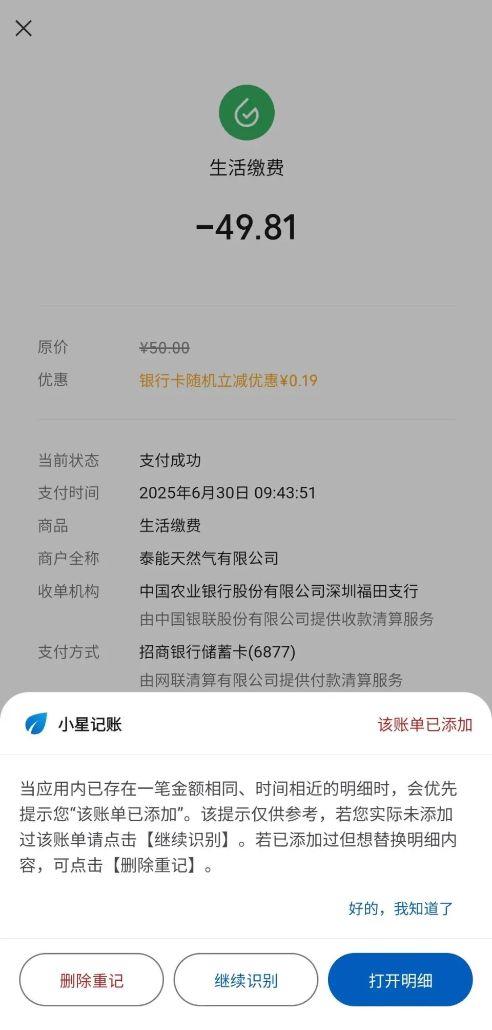 在最近一次更新中,小星记账增加了自动记账的「替换」操作。考虑在某些特殊场景下,已经识别到的账单可能会有内容更新,或者因为支付 App 的格式发生变化、自动识别存在错误等。此时当我们再次打开已经被自动记账识别过的账单页面时,弹出窗口中除了查看明细和识别两个功能按钮外,我们还可以使用「删除重记」功能重新识别并完成记账。