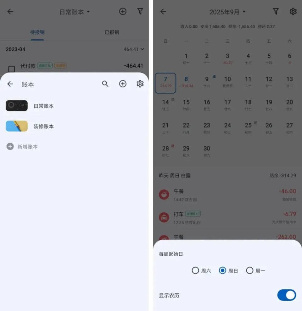 小星记账在近期更新中还优化了账户切换逻辑,我们现在可以直接在报销、借贷等场景下直接切换账户。除此之外,新版也优化了日历视图的功能,并针对微信、云闪付、京东等 App 的更新进行了自动记账适配,最新版账单格式也可以正确识别了。