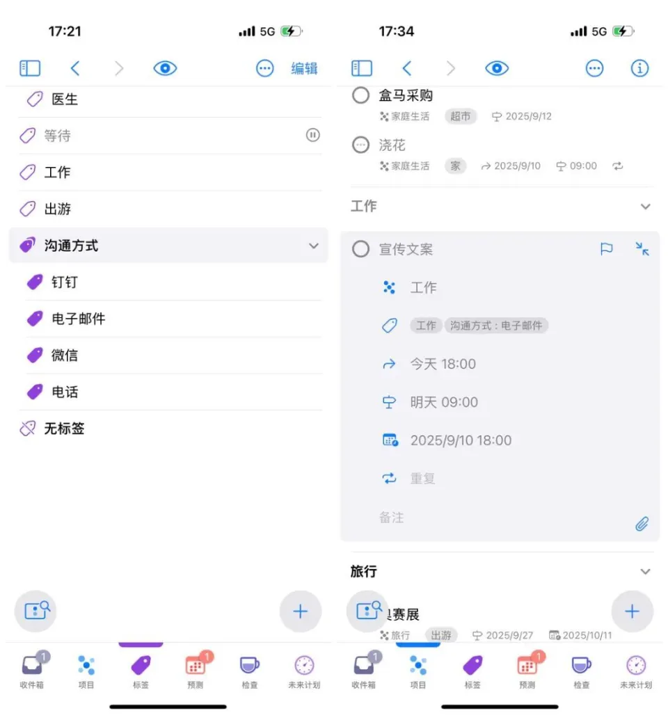 此次更新新增的「标签互斥」则可以便于你更好地进行项目管理,很多任务天生具备互斥性质,例如某些任务只能白天进行,某些只能晚上完成。在日常工作中,我也需要对不同事项采取与之适配的沟通方式。因此,我在检查器中将沟通方式标签组中的微信、电子邮件、电话等标签设置互斥,正式通知或会议我会采用电子邮件,日常沟通交流事项我则选择标记微信。一方面,互斥标签可以更便捷地帮助你管理一类事务,另一方面如果项目性质变化,可以直接替换这一标签,而无需删除再重新添加,也算是微微提升管理效率吧。