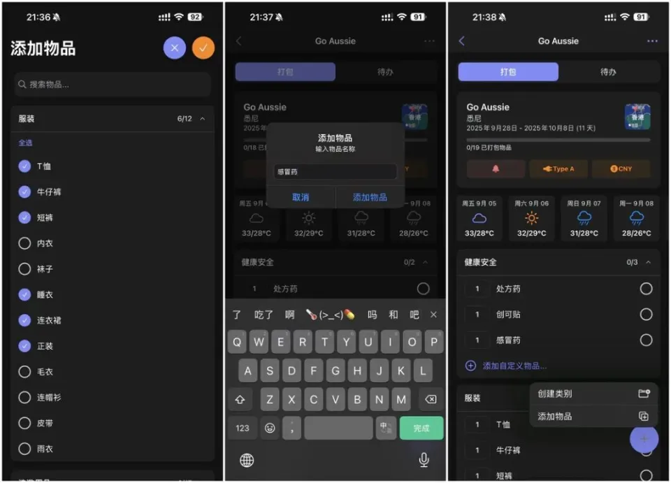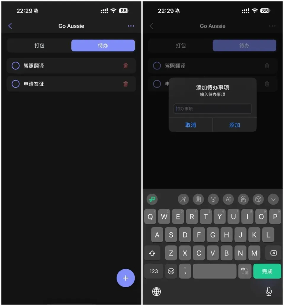 除了旅行直接相关的物品准备,我们也可以在待办标签页中单独添加其他的待办事项,用起来就像普通的待办事项工具一样。