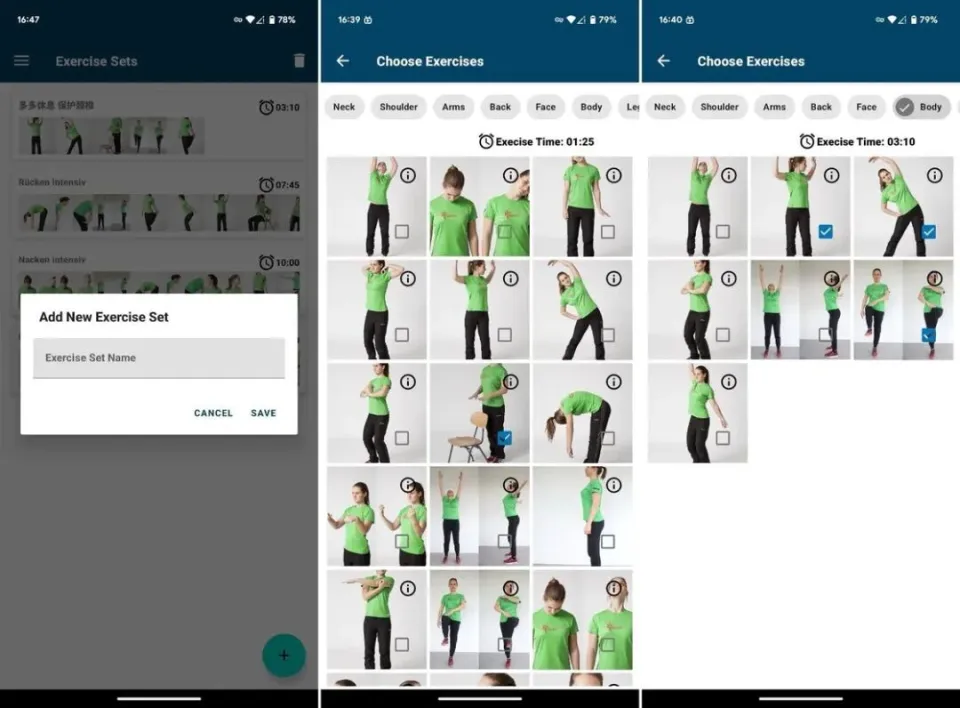 从脖子到肩膀,再到肩、背、腿等,Aktivpause 默认的动作库涵盖了主要的身体部位,自由组合便能达到轻度锻炼的目的;同时每个动作都有对应的推荐时长,且给出了具体的动作说明,遗憾的是应用暂不支持中文。选择运动并完成后,应用还能自动计算并统计运动总时长。