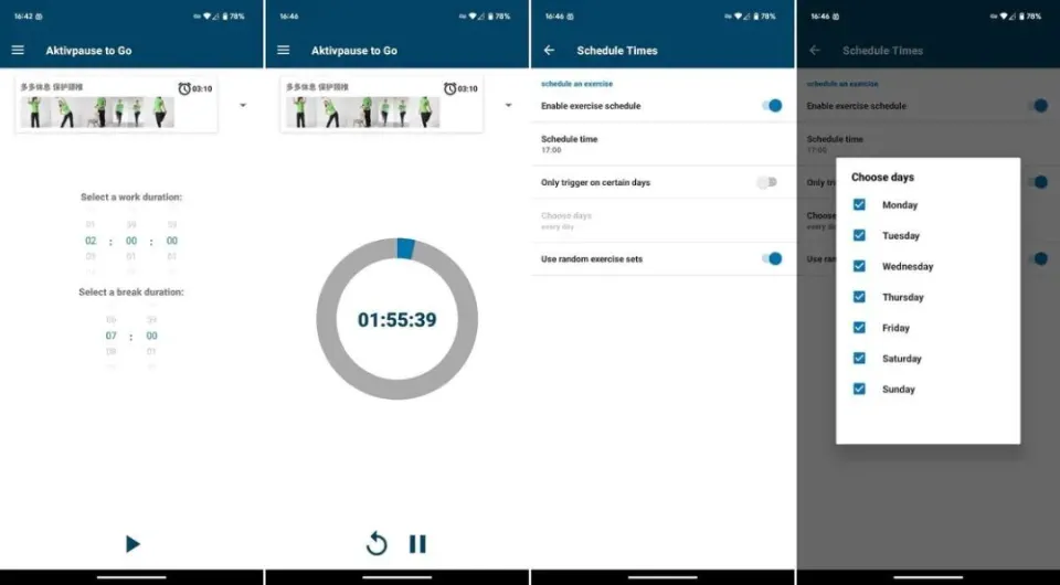 借助 Aktivpause 开展工作间隙训练时,我们需要来到 Aktivpause to Go 这一界面,选择想要使用的动作组,然后选择一个合适的连续工作时长和锻炼时长。当工作时长达到目标,Aktivpause 会提醒我们开始运动。此外我们还可以在设置界面来开启定时运动提醒,设置诸如每周固定日期和时间锻炼。