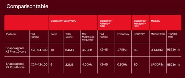 骁龙 X2 Plus提供两款型号:X2P-64-100(十核)与X2P-42-100(六核),均搭载高通第三代Oryon架构,采用台积电N3P 3nm工艺制程。