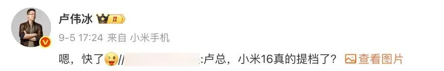 此前有消息表示,小米16系列将要提档,提至9月下旬发布,吸引了大量关注。随后,卢伟冰也在第一时间对这个消息进行了确认,称“嗯,快了”。