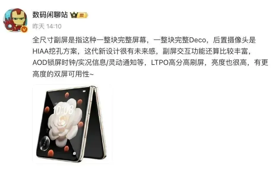 此前爆料则显示,其配备的是全尺寸副屏,即一整块完整屏幕,一整块完整Deco,后置摄像头是HIAA挖孔方案,副屏交互功能比较丰富,AOD锁屏时钟/实况信息/灵动通知等,LTPO高分高刷屏,亮度也很高,有更高度的双屏可用性。