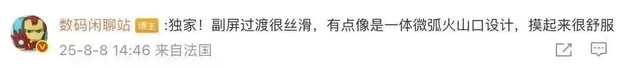 该消息源还表示,这块副屏过渡很丝滑,有点像是一体微弧火山口设计,摸起来很舒服。