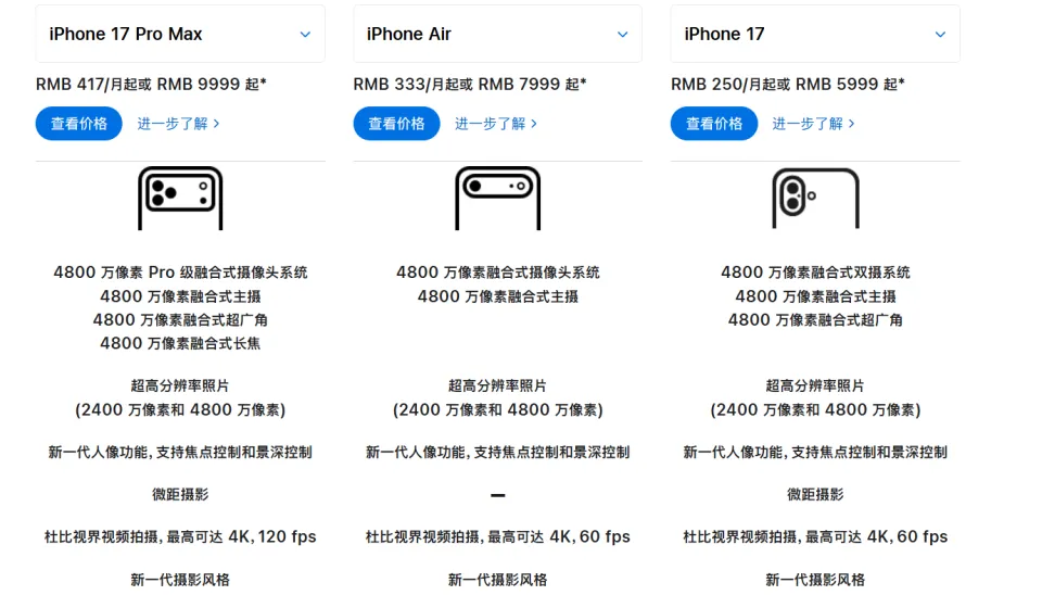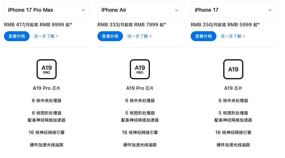 Pro版本A19 Pro,满血版,6核CPU以及GPU;Air也是A19 Pro,不过是“阉割”过的6核CPU以及5核GPU;标准版A19,6核CPU以及5核GPU,符合苹果一贯做法。