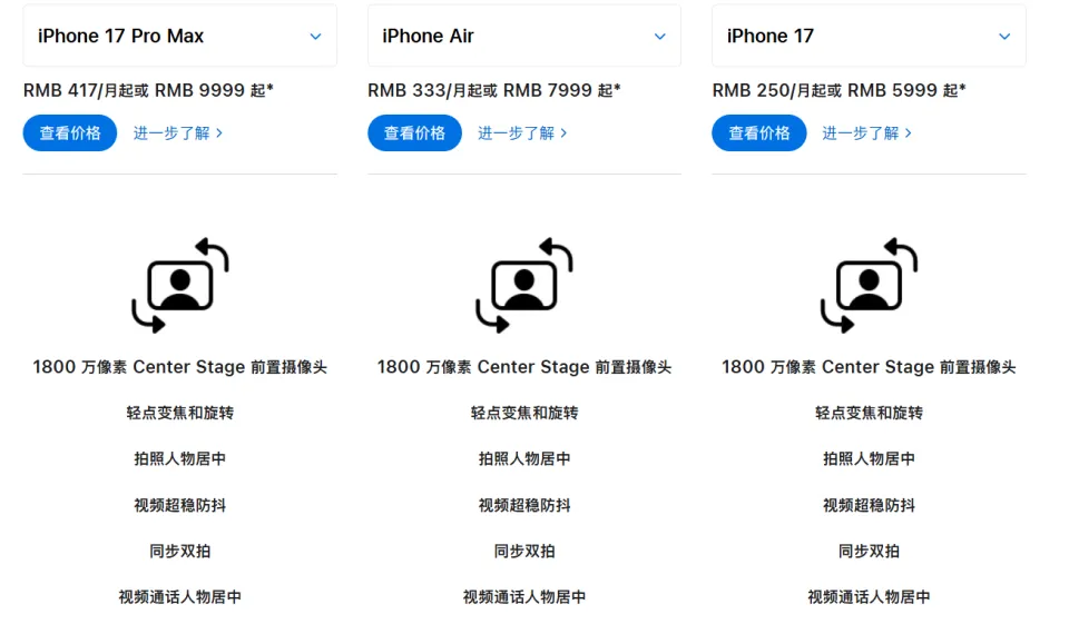 这次iPhone 17做了一点改变,整个系列的前置摄像头都升级到1800万像素,并且是正方形的传感器,取景范围要更大一些,自拍可以容纳更多人了,并且支持人物居中。