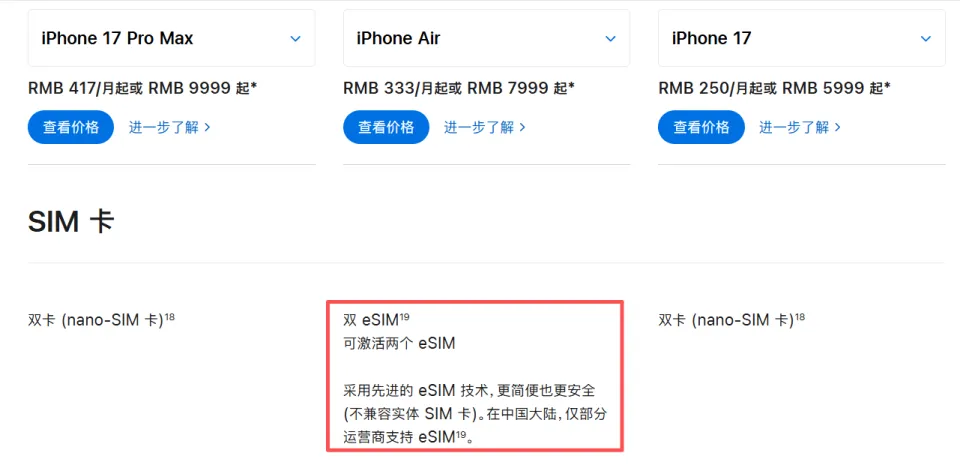 iPhone Air这次在国内没有特供版,在国内也是eSIM,只支持联通eSIM,后面会不会支持其他运营商,咱们不知道。
