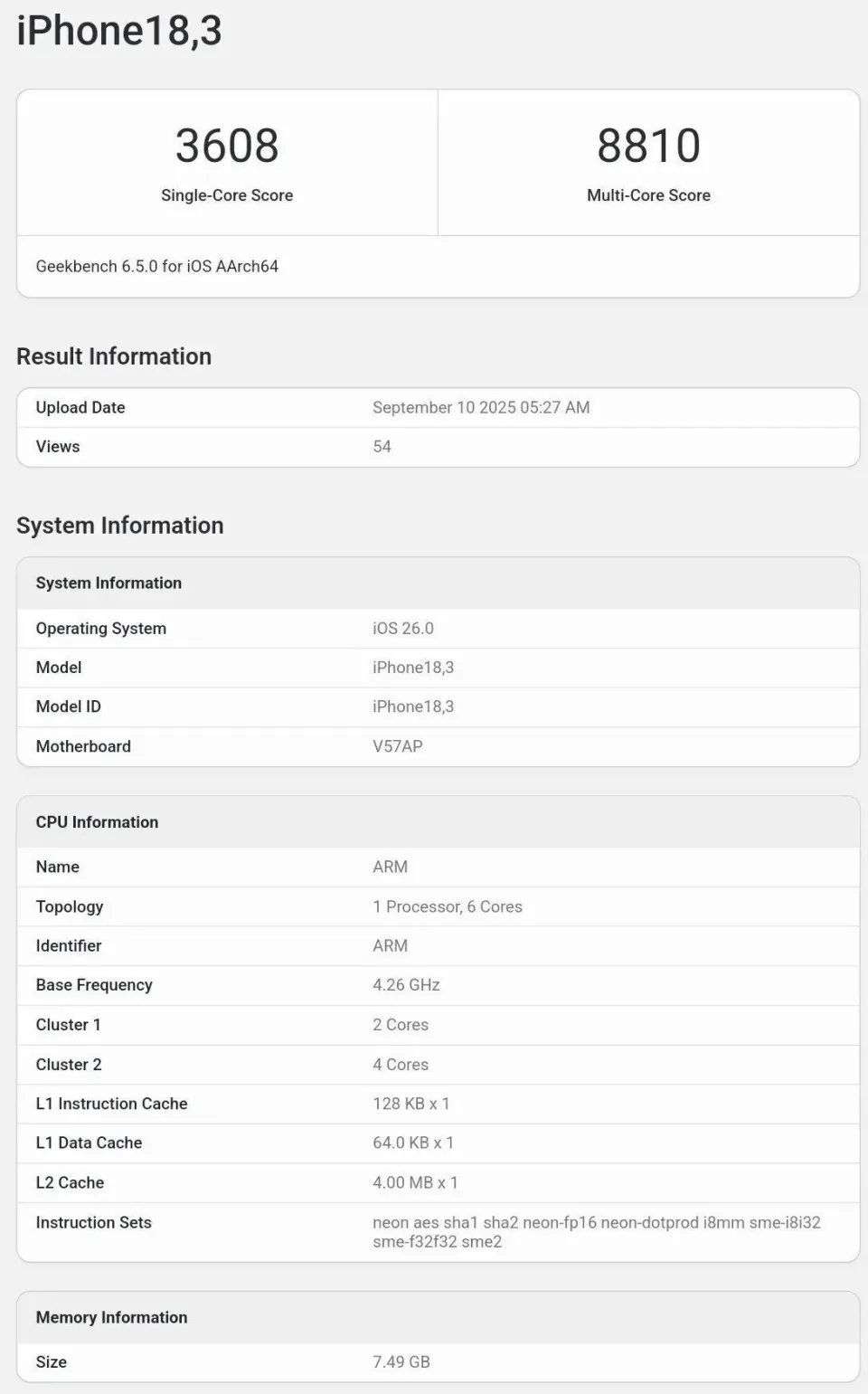 根据 Geekbench 6 跑分,iPhone 17 标准版的单核/多核是 3608/8810,多核甚至比 A18 还弱些(9136)。