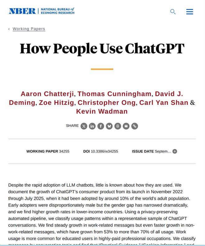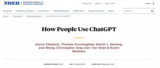 智东西9月16日消息,OpenAI经济研究团队与哈佛大学经济学家大卫·德明(David Deming)联合在美国国家经济研究局(NBER)发布一篇论文《人类如何使用ChatGPT(How People Use ChatGPT)》。