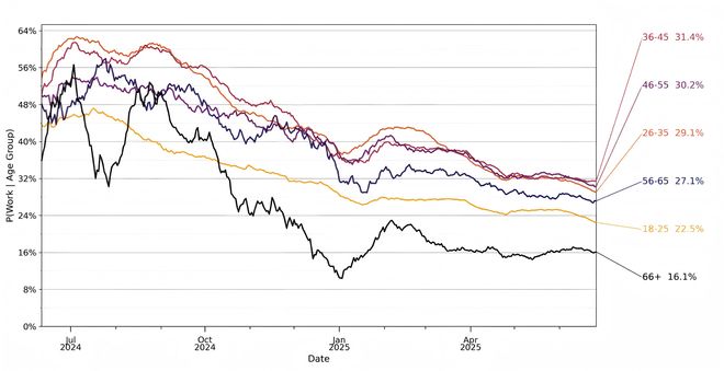 年龄层面,尚有一定鸿沟。据悉,18至25岁用户贡献了近一半的消息量,而随着年龄增长,消费者将AI用于工作的比例也越来越高。此外,自称66岁以上的用户向ChatGPT发送的工作消息比例最少,但依然有16.1%的高龄打工人正在使用AI上班。