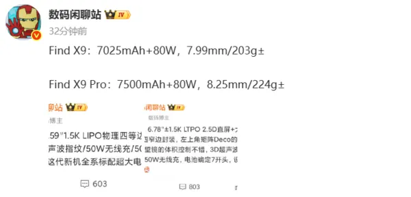 据知名数码博主@数码闲聊站 最新发布的信息显示,与此前曝光的消息基本一致,全新的OPPO Find X9系列先期将带来Find X9与Find X9 Pro两款机型,其中OPPO Find X9将内置7025mAh大容量电池,支持80W有线快充,机身厚度控制在7.99mm,重量为203g左右;而OPPO Find X9 Pro电池容量有望进一步升级至7500mAh,支持80W有线快充,机身厚度为8.25mm,重量约224g。而此前OPPO Find系列产品负责人周意保也曾透露,OPPO Find X9 Pro在与前代保持相同的8.25mm轻薄机身下,电池容量增加超过1500mAh。作为参考,OPPO Find X8 Pro厚度为8.24mm,电池容量为5910mAh。