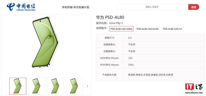 IT之家 9 月 21 日消息,型号为“PSD-AL80”的华为 nova Flip S 小折叠手机已现身中国电信终端产品库。该机提供 12GB+256GB、12GB+512GB、12GB+1TB 三种存储规格,拥有樱语粉、零度白、天青蓝、星耀黑、羽砂黑、向新绿六种配色,产品零售价格尚未公布。