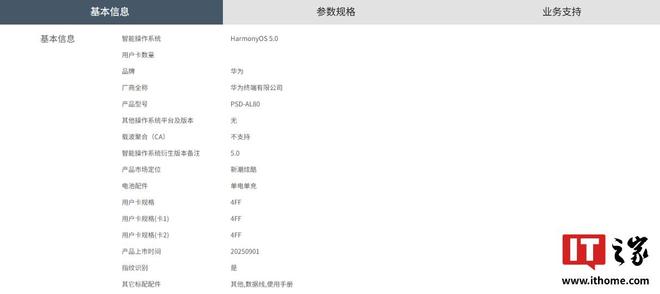 该机产品市场定位“新潮炫酷”,外壳材质为玻璃,屏幕分辨率为 1920*1200,预装鸿蒙 HarmonyOS 5.0 系统,支持指纹识别等。需要注意的是,该机尚未公布具体配置信息,参考现款 nova Flip 小折叠手机的内屏分辨率为 2690×1136,与 nova Flip S 差异较大,因此产品库的信息有可能为伪装信息。