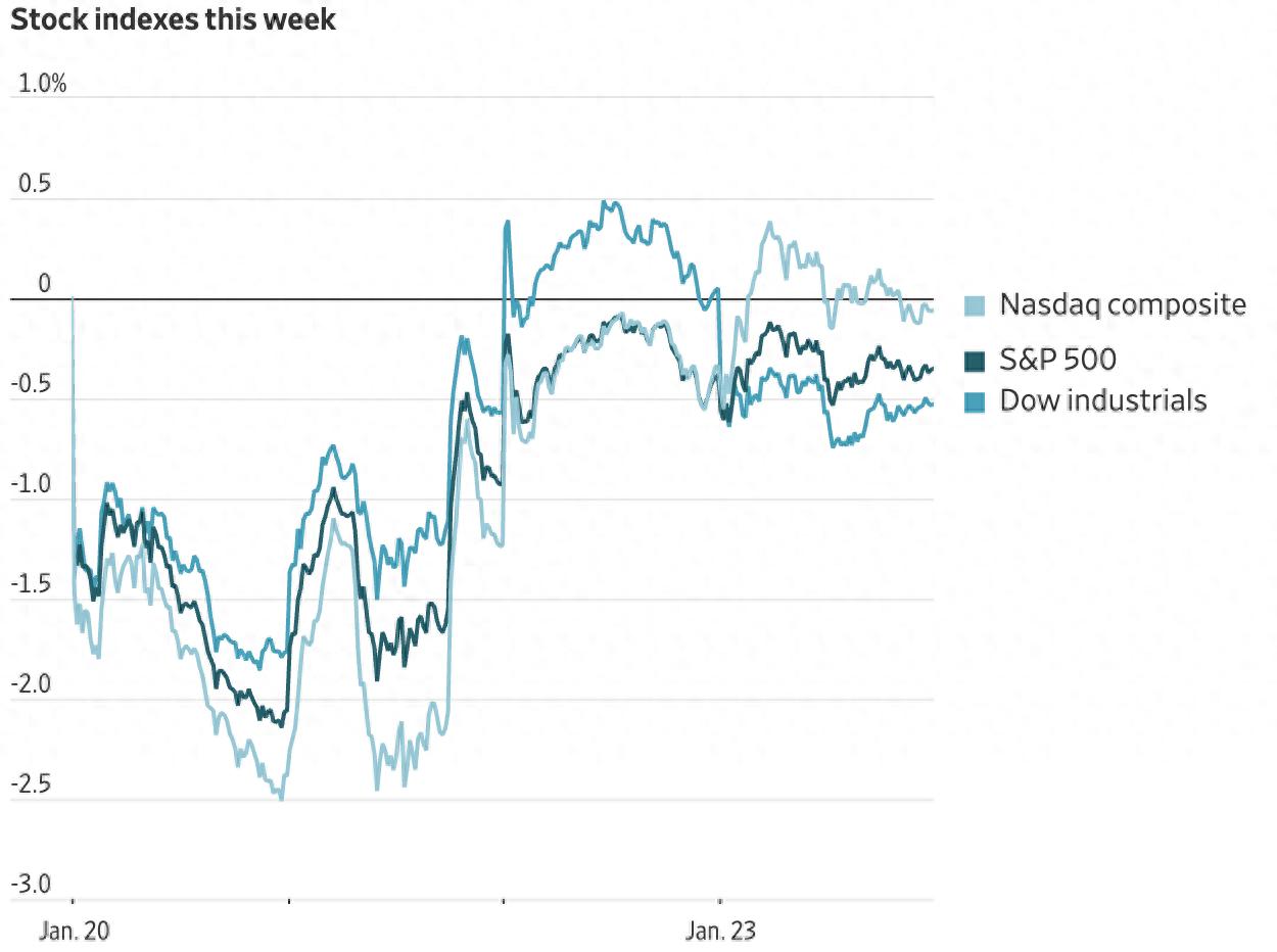 财联社1月24日讯(编辑 夏军雄)美东时间周五,三大指数涨跌不一,纳指小幅上涨,标普500指数微涨,道指跌近0.6%。