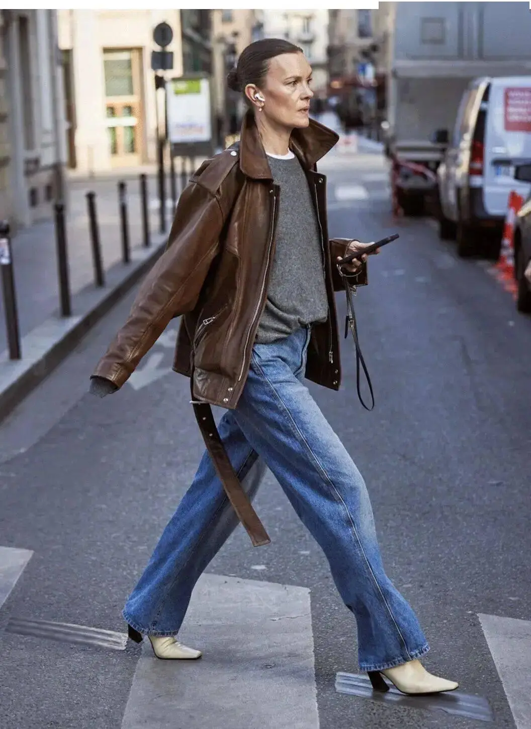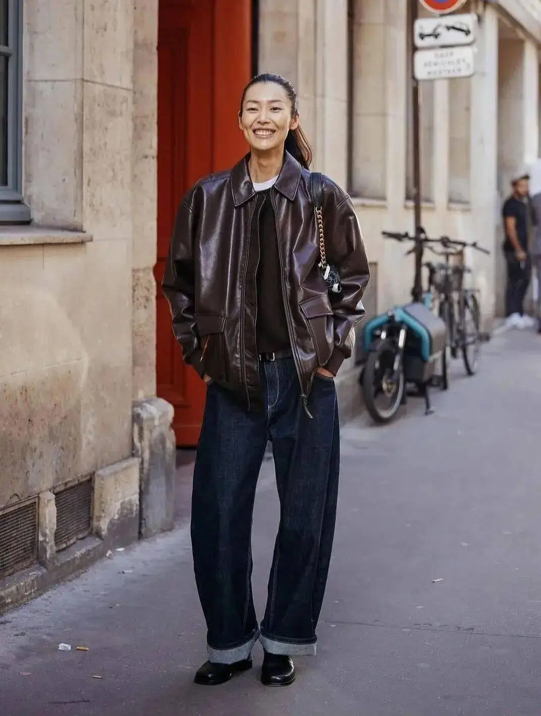 牛仔阔腿裤自带经典标签,不挑腿型、包容万千,与皮夹克的搭配更是复古味十足。尤其是暖咖色皮衣搭配牛仔蓝,仿佛瞬间穿越至80年代的巴黎街头,慵懒而浪漫,秋冬氛围感直接拉满。
