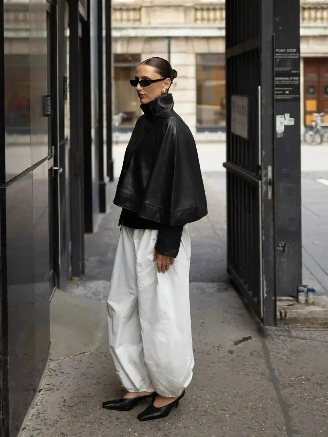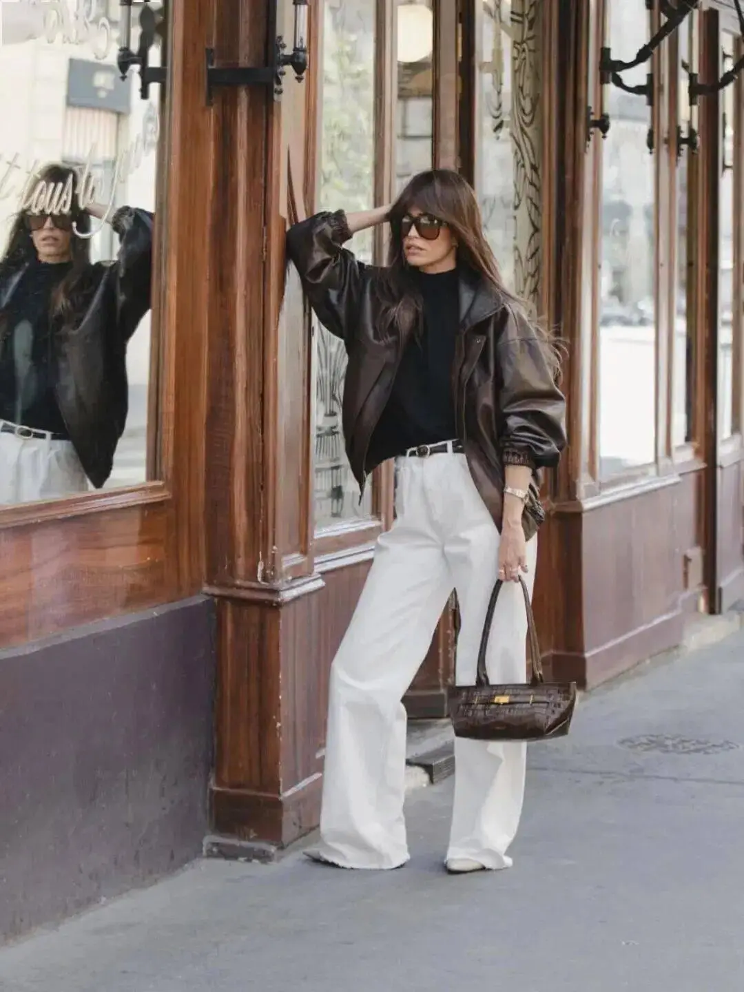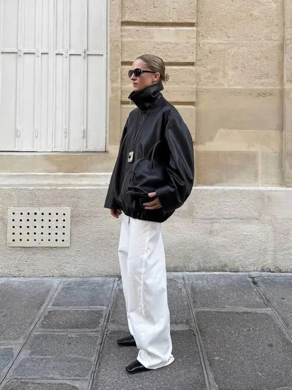 2. 皮夹克 × 白色阔腿裤:清新减龄,黑白永恒经典