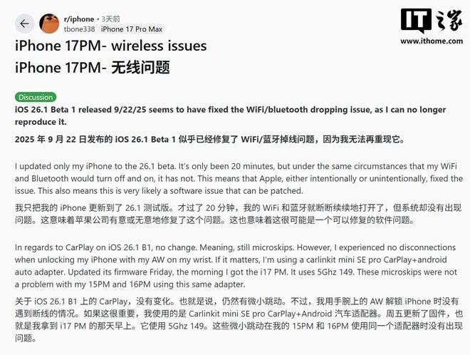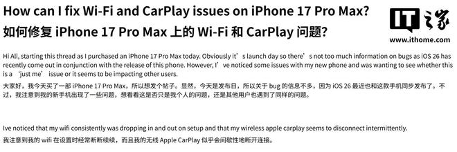 据 MacRumors 论坛、Reddit 以及 Apple 支持社区上的用户反馈,解锁 iPhone 17 、iPhone Air,iPhone 17 Pro、iPhone 17 Pro Max 后,网络会短暂中断再自动恢复。由于 CarPlay 依赖 Wi-Fi 连接,这一问题也导致车载系统中断使用。