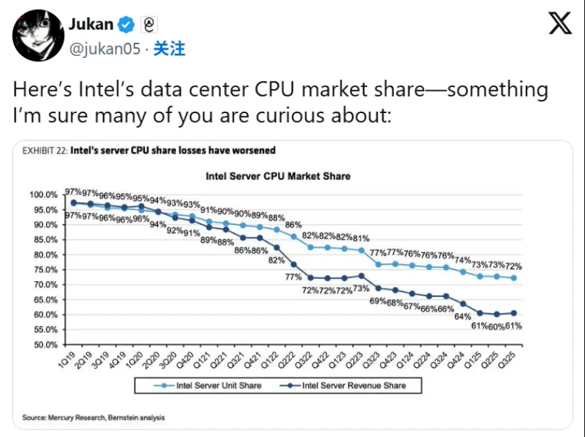 这一差距的持续收窄反映出AMD正以前所未有的速度缩小与行业领先者的距离。回顾数年前,英特尔在该领域曾占据超过八成的份额,处于绝对优势地位。