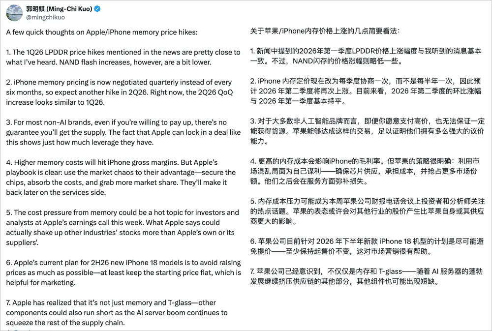 不过,即便零部件成本持续上升,郭明錤认为苹果会尽量自行消化压力,至少在 iPhone 18 系列的起售价层面保持稳定。