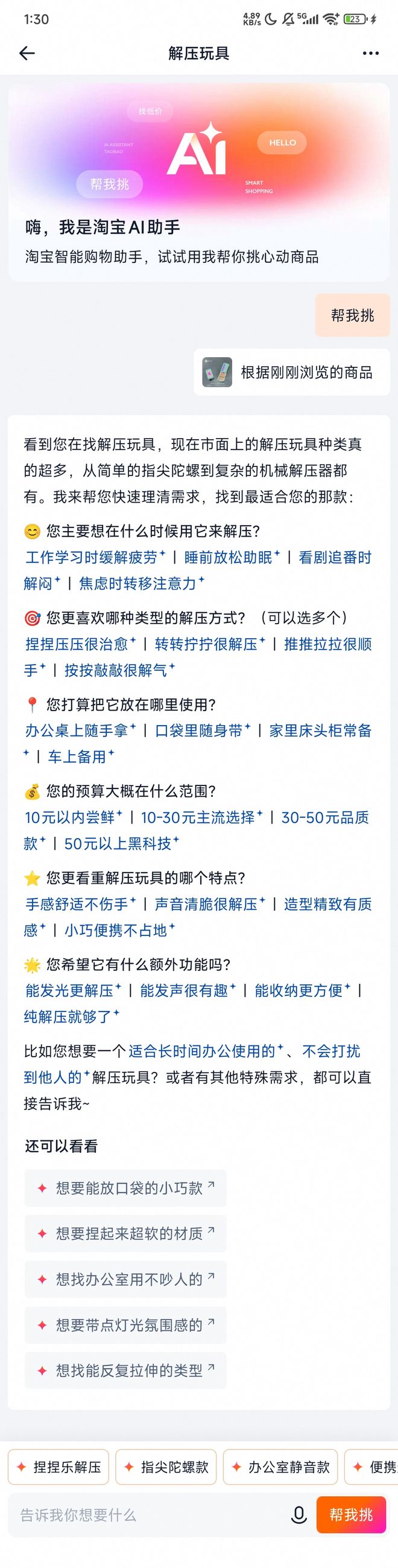 用户在发出“解压玩具”需求的时候,很少有人能想到这么多的产品维度。AI助手其实可以看作是一个辅助筛选决策的生成式说明书,解决用户“临门一脚”的筛选门槛。