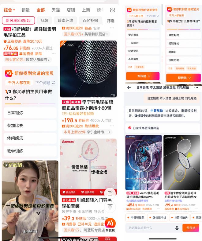 在测试中,“AI帮你找到合适的宝贝”不会在所有浏览页中掉落。比如指向明确的带着商标甚至型号的商品搜索,类似指定型号的羽毛球拍搜索,一般就不会掉类似的提示。