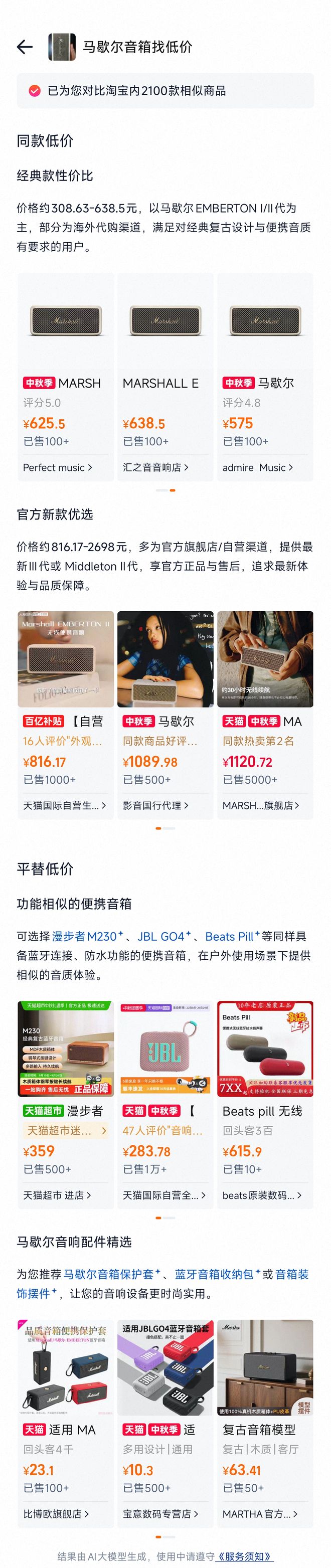 这是我在朋友家看到的音响,觉得很不错,于是拍了个照传给拍立淘。然后你在右下角能看见一个“AI找低价”的按钮,点进去就可以跳出一个新的页面。