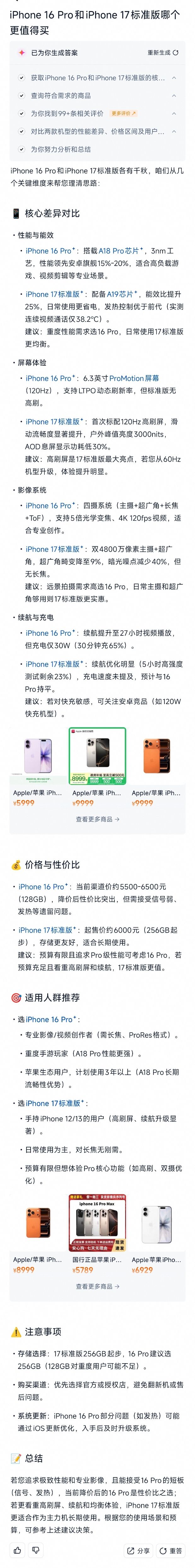 比如,我问AI万能搜,“iPhone16 pro和iPhone17怎么选?”它的对比结果是这样长长的一条,包含了核心参数、使用人群推荐。AI万能搜甚至会直接给出很明确的价格段分析,告诉用户16pro 128G目前的价格段是5500-6500元。