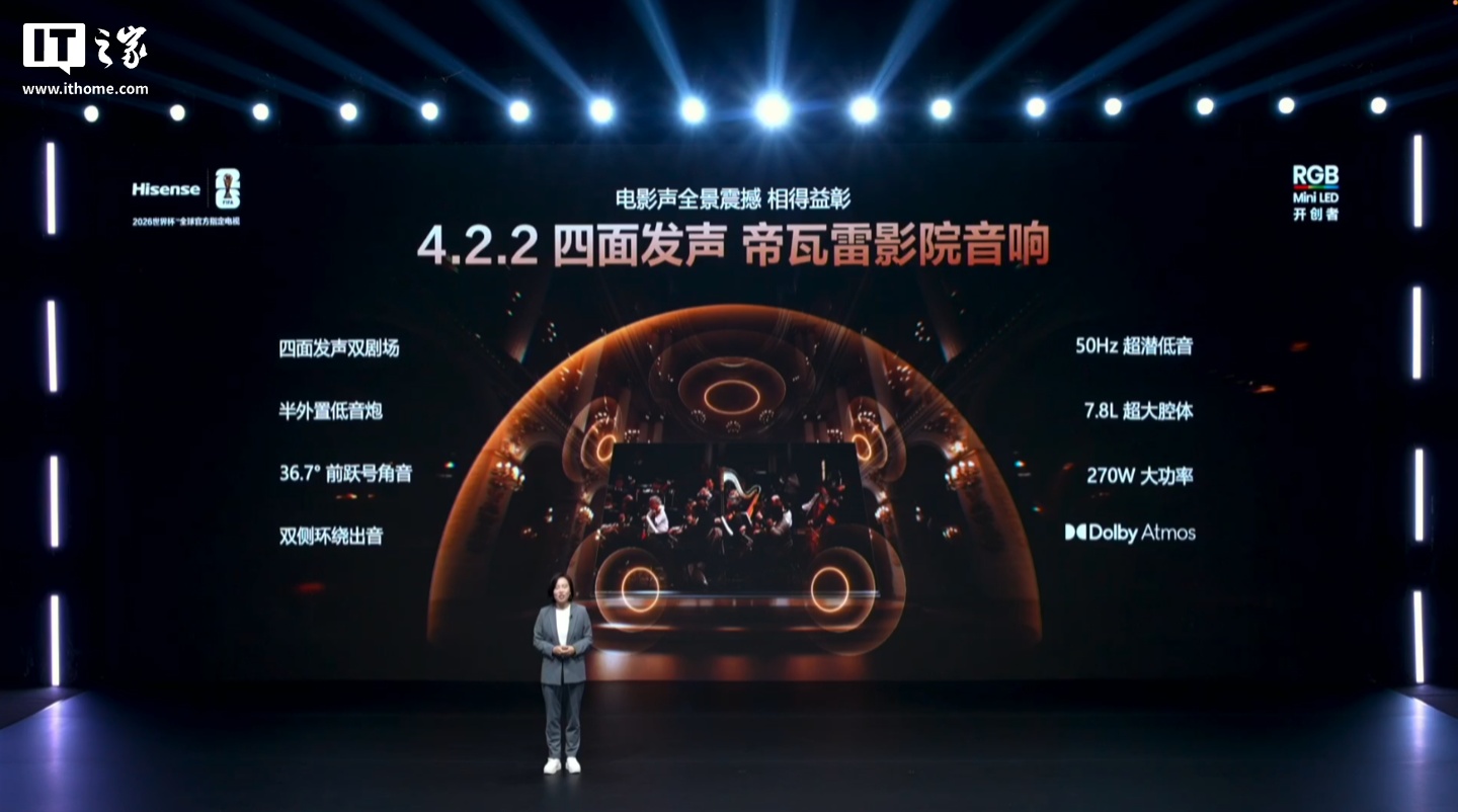 此外,海信还联合帝瓦雷为 U7S Pro 定制了 4.2.2 内置音箱,最高功率可达 270W,低音炮采用半外置设计,低音可下潜至 50Hz,号称能打造“四面发声双剧场”,支持杜比全景声等技术。