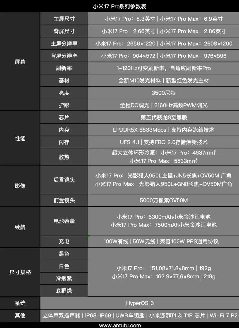 而小米17 Pro Max,除了长焦外,其他镜头参数与小米17 Pro保持一致。