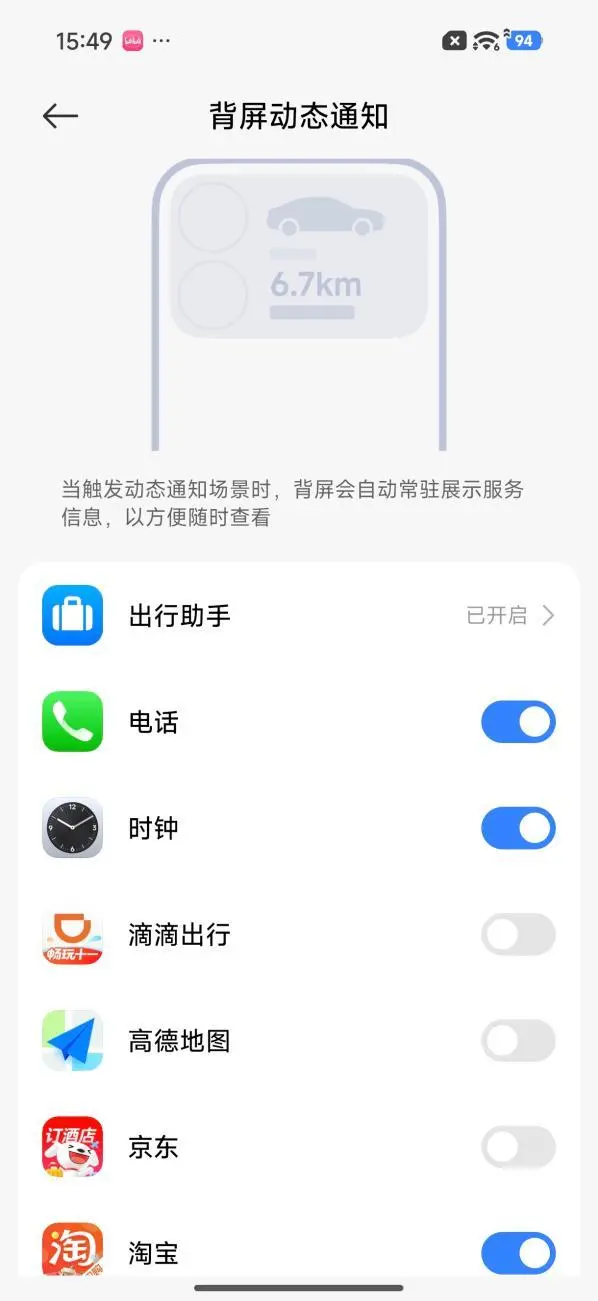 再者,妙享背屏动态通知支持十大常用场景,具体包括飞机、火车、打车、车控、外卖、电影票、音乐、电话、倒计时和闹钟。比如,当你在听音乐时,背屏会自动变成播放器,无需亮屏,便可以在背屏切歌、暂停播放等操作;当你使用滴滴打车时,背屏会显示车牌号和司机信息;点外卖时,背屏会显示配送进度。