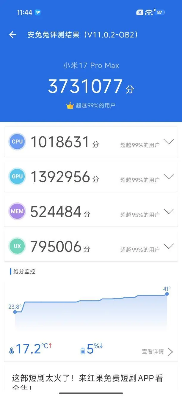 而小米17 Pro Max最高成绩为3731077,其中,CPU得分1018631,GPU得分1392956;MEM得分524484;UX得分795006。