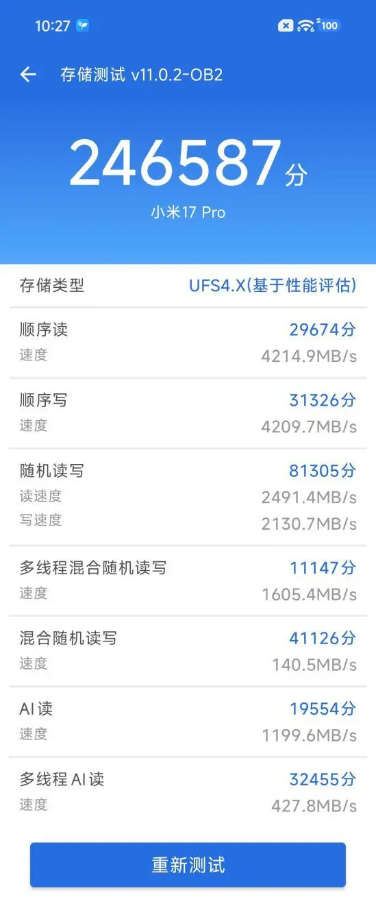 存储部分,小米17 Pro系列内置LPDDR5X内存(8533Mbps)和UFS 4.1闪存。小米17 Pro总得分为246587。其中顺序读得分29674,速度为4214.9MB/s;顺序写得分31326,速度为4209.7MB/s;随机读写得分81305,读速度为2491.4MB/s,写速度为2130.7MB/s;多线程混合随机读写得分11147,速度为1605.4MB/s;混合随机读写得分41126,速度为140.5MB/s;AI读得分19554,速度为1199.6MB/s;多线程AI读得分32455,速度为427.8MB/s。