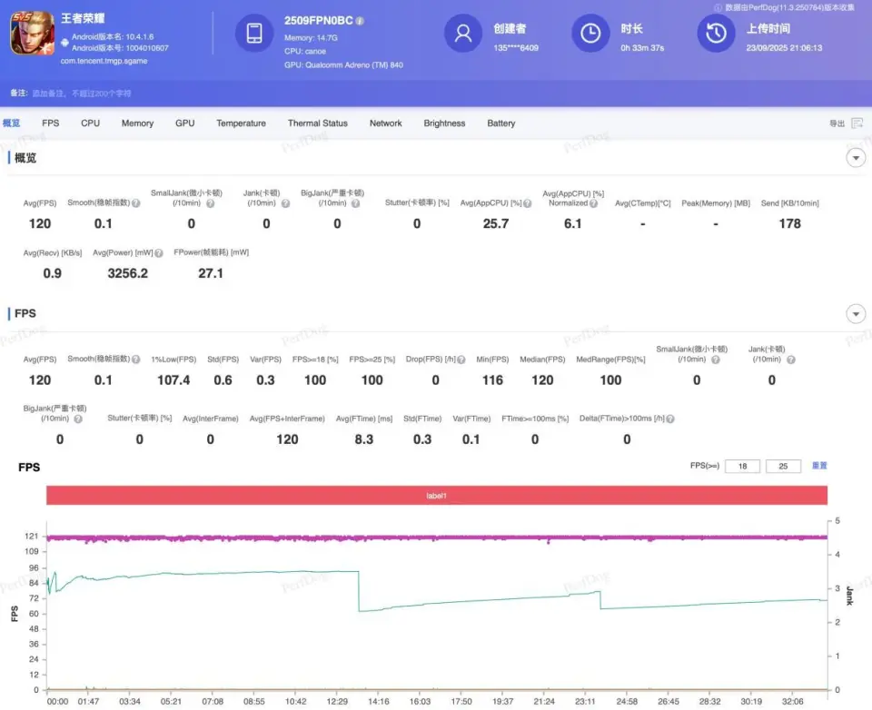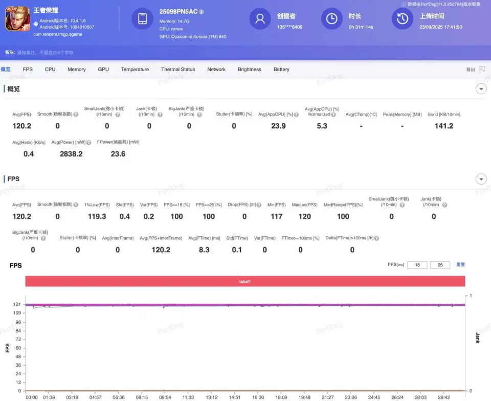 同样室温和机身温度为25度,手机满电,开启性能模式,使用小米17 Pro游玩30分钟最高画质《王者荣耀》5V5排位赛,画面平均帧率为120.2 FPS,1%的Low帧为119.3 FPS,没有任何卡顿,帧率曲线图呈一条直线,哪怕是打团战,画面帧率也依旧稳定。
