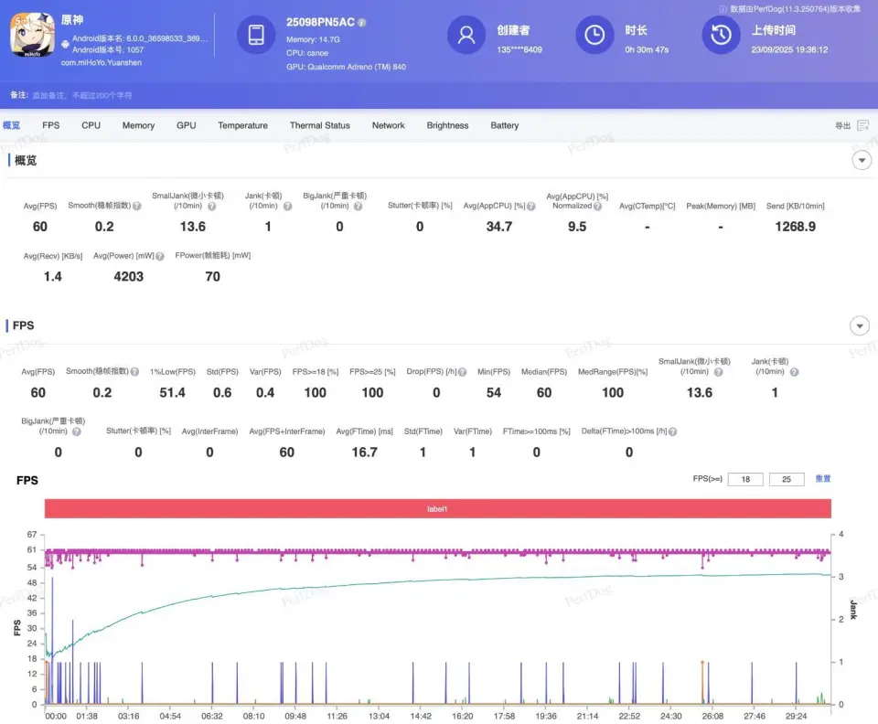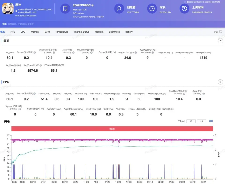 而小米17 Pro Max跑《原神》画面帧率同样稳定,平均帧率为60.1 FPS,1%的Low帧为51.4 FPS,每10分钟有10.4次微小卡顿和0.3次卡顿。