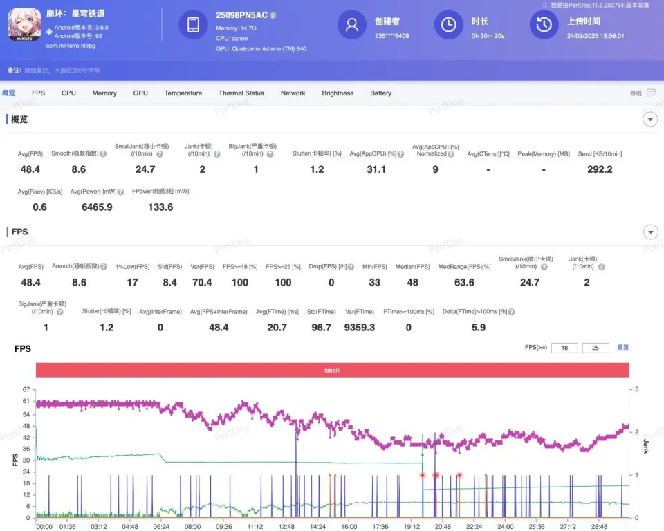 同样是极高画质,《崩坏:星穹铁道》匹诺康尼黄金的时刻跑图30分钟,小米17 Pro画面平均帧率为48.4 FPS,1%Low帧为17 FPS,每10分钟有24.7次微小卡顿,2次卡顿和1次严重卡顿。