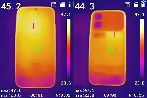 此时,小米17 Pro正面和背面最高温度均达到了47.1℃,发热主要集中在后置Deco处和顶侧边中框,掌托区域和手指触控区域会比较烫手,存在低温烫伤的风险。